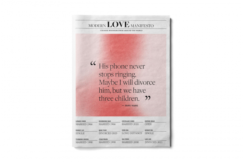 为了回答这个问题,Ying Han采访了不同年龄、背景的人群,收集对“爱”的定义与描述。从真实语料出发,她将情感与语言转译成了一系列富有张力的视觉海报。“我的作品包含两个关键的视觉元素:抽象的阴影背景和黑色文字。我用这些元素放大了个人视角。阴影和色彩象征着爱情微妙而短暂的本质,既展现了爱情的优雅,也表达爱情的变幻莫测。我采访了不同年龄、性别和人生经历的人,并将他们的心声汇集于此。”她回忆到。