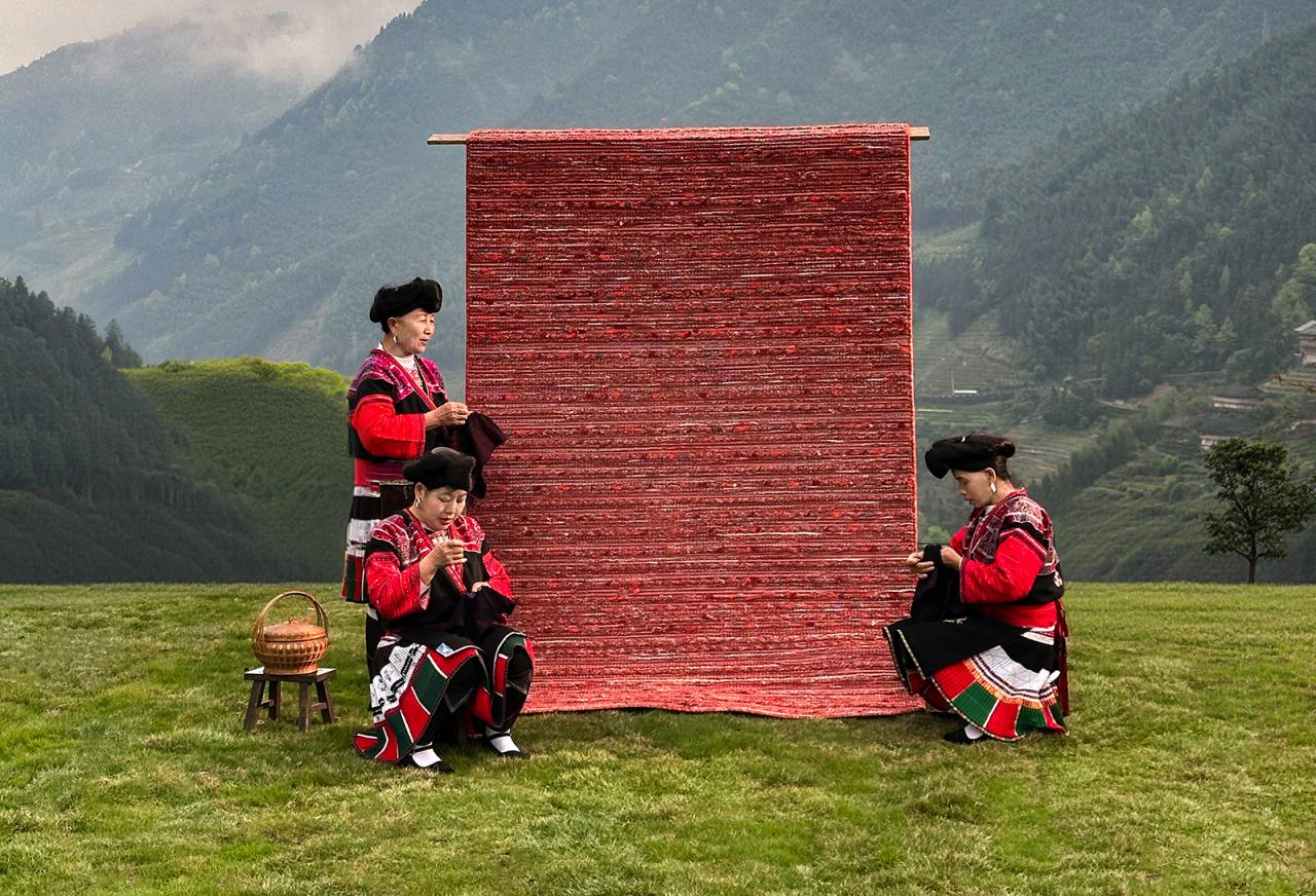 赛波斯设计团队敏锐地观察到,红瑶织艺最动人的部分是绣娘在织造时,纱线拉紧、拧转、松弛间形成的微小起伏——是一种饱含生命张力的“手工状态”,每一寸肌理都像是自然生长而成。