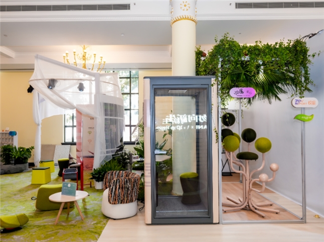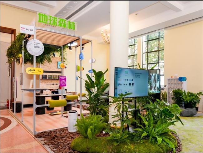 步入地球森林展区映入眼帘的是本次展会的核心叙事空间——“碳索森林创新空间,这座室内的微缩森林正是以“森林中央公园”为设计灵感,颠覆性地打破了室内与户外、工作与休憩、个体与生态的边界。这里,森林绿植、智能物联系统、多元化功能家具与可持续装配式材料并非孤立存在,而是被编织成一个有机的生态矩阵。创新植入的WellTek Inside技术,让空间的环境舒适度拥有了智能感知与调节的能力,真正将森林呼吸感无缝引入室内。在光环境营造上,系统结合ADL超级控光算法,动态调节光强与色温,精准模拟万象自然光,重塑室内的节律照明。