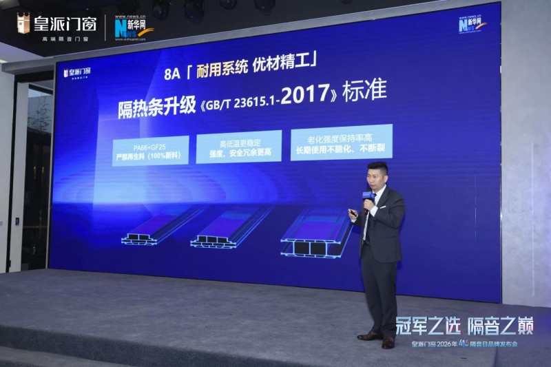 发布会现场,皇派门窗正式发布隔音门窗8A标准。研发中心总监周谱峰表示,该标准从隔音、锁温、气密、水密、抗风、安全、耐用、美学八大维度,系统化定义高端隔音门窗的硬指标。