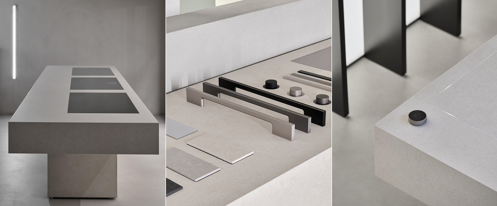 装置的核心是一张长条形雕塑感餐桌,它既是舞台、操作台,也是交汇点。桌面搭载瑞族V-ZUG新品Integra系列隐形电磁灶,将感应技术嵌入由纯净天然矿物打造的连续台面之中。技术退隐于无形,只在你需要时温柔显现,灶具、料理台、餐桌三重场景,在不同场景需求中无缝切换。
