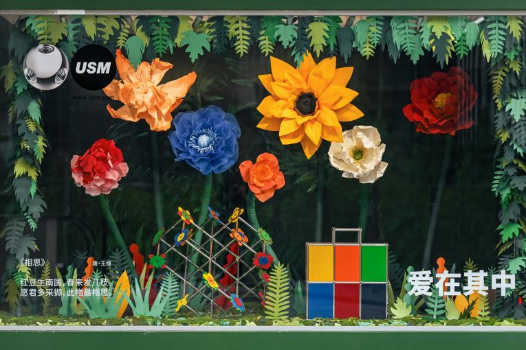 西岸梦中心2F橱窗作为展览的视觉入口,以 USM Haller系统为骨架,辅以几何化纸质花卉装置,形成本次展览的标志性视觉画面。橱窗以王维《相思》作为文字注脚,在古典诗意与当代设计语言之间形成呼应。结构之中,藏着最柔软的情感。